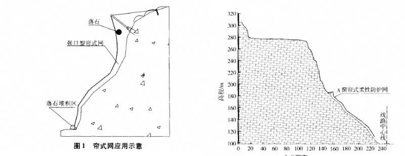 窗簾式柔性防護(hù)網(wǎng)采用“引導(dǎo)”的理念控制歐式,即通過柔性防護(hù)網(wǎng)與山體間的夾縫對落石進(jìn)行引導(dǎo)和約束。讓落石按照規(guī)定好的線路滾落到指定的落石堆積區(qū)。