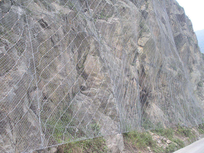 GAR2型主動防護(hù)網(wǎng)是采用Φ8的鋼絲繩(抗拉強(qiáng)度為1770Mpa,破斷拉力>40KN)編制并在結(jié)點處用專用“十字扣”固定而成,為邊坡防護(hù)網(wǎng)的主要特征構(gòu)件之一,在主動防護(hù)中通過鋼絲繩網(wǎng)的覆蓋來實現(xiàn)邊坡的加固,其開放特征可以實現(xiàn)對坡面天然植被和植被生長條件的最佳保護(hù),實現(xiàn)環(huán)境保護(hù)與災(zāi)害治理的有機(jī)結(jié)合;在被動防護(hù)系統(tǒng)中,其柔性特征充分體現(xiàn)了“以柔克剛”的思想,實現(xiàn)崩塌落石的有效攔截。