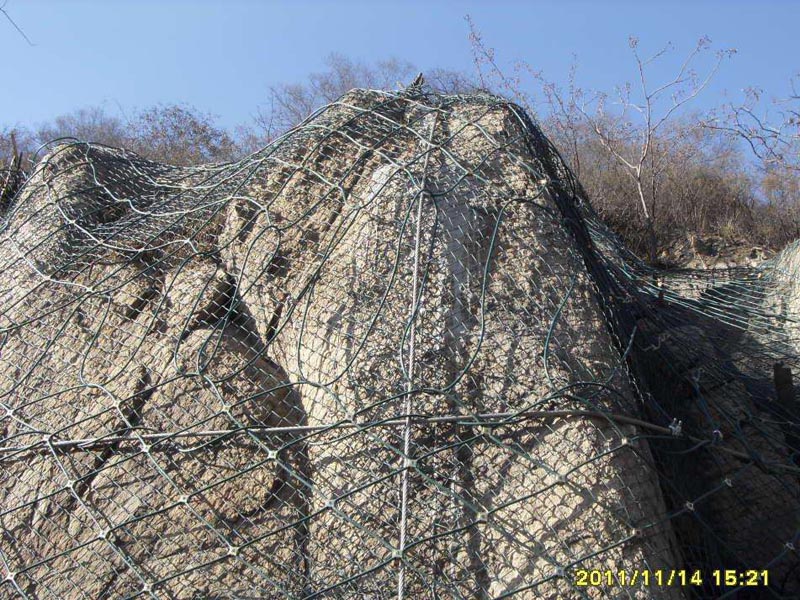邊坡防護網的安裝,洞口安裝邊坡防護網主要以安裝主動防護網的方式進行保護,將洞口四周的山體用主動防護網團團包括,防止落石滾落堵住洞口。石窟其他很多地方采用安裝被動防護網的防護網的方式進行落實的攔截,防止墜落的巖石對石窟造成嚴重的破壞。有這第九大奇跡沒成的龍游石窟我們沒有理由不保護它,它對人類研究動物的繁衍生息和中國的歷史發展有著非常重要的意義,或許現在我們并不能從中得到太多的相關信息,但可以留給后人,等待科技更發達的時候或許有著突破性的發現。